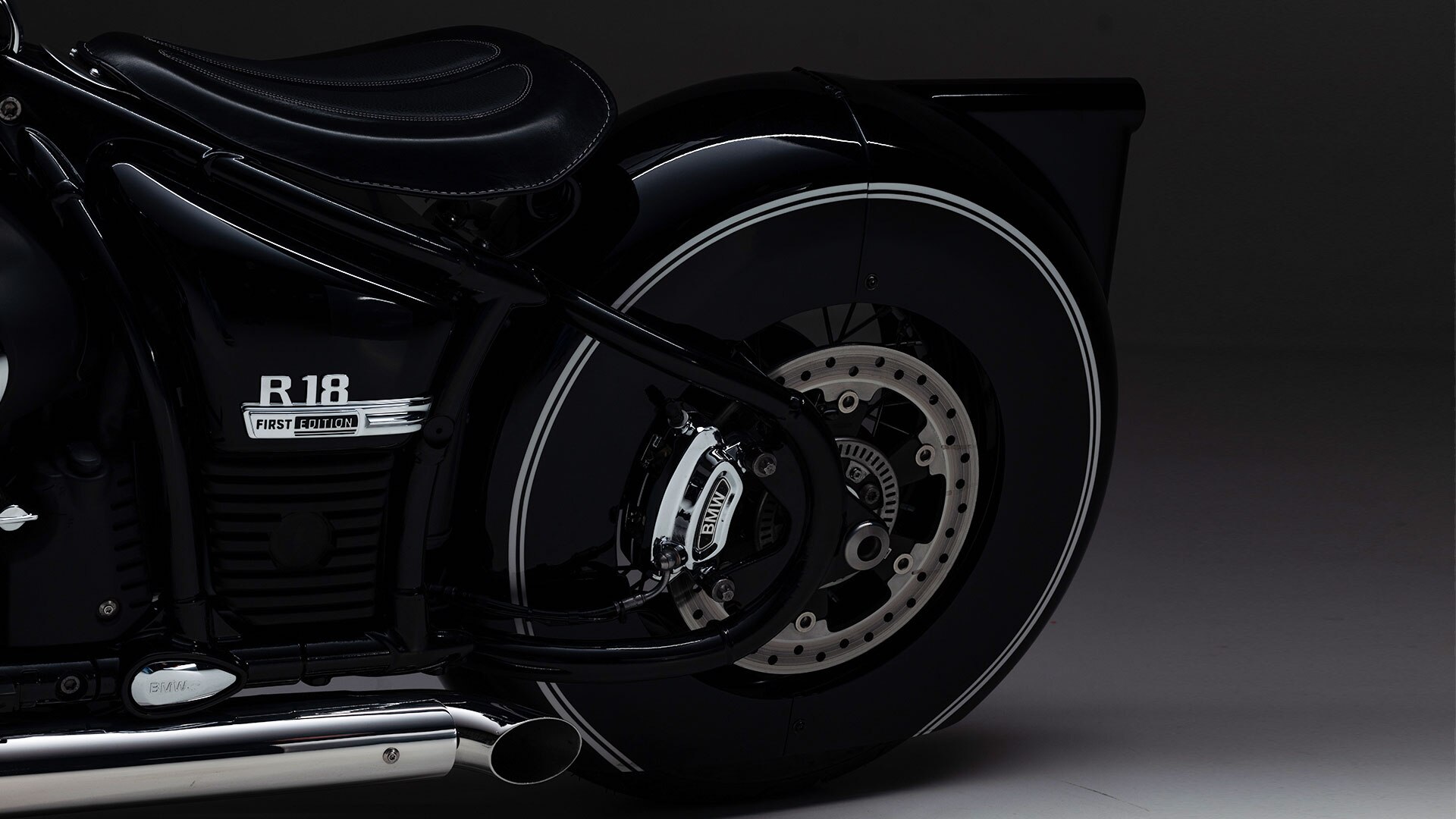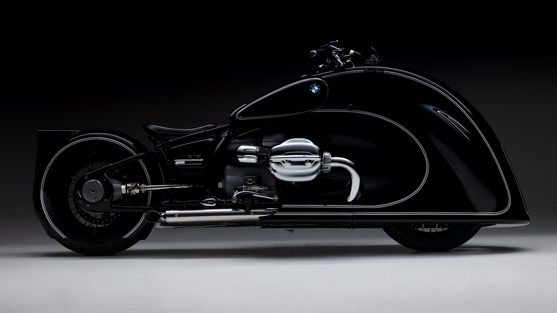 The trim panel fits around the fuel tank with a gap of just 8 mm. Its traditional colour scheme featuring the iconic double lines thus continues virtually seamlessly on the impressive, hand-built component. It goes without saying that the paintwork also decorates the rear-wheel cover, which covers an incredible 310 degrees and perfectly extends the front-end design. A hinge mechanism makes it possible to change the wheel on this bike. Precisely positioned openings give a view of the disc brake and drive system. It also becomes obvious here what makes the soul of the Spirit of Passion: it approaches the design of the R 18 with utmost respect while simultaneously becoming a true masterpiece itself.